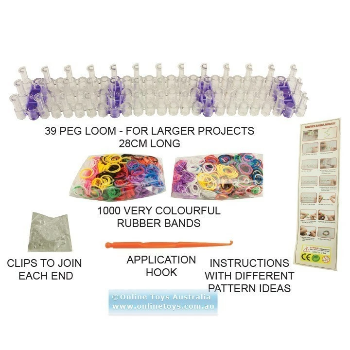 Contents: 1 Loom, 1 Hook, approximately 1,000 rubber bands (various colours), 24 S Clips, Instructions.