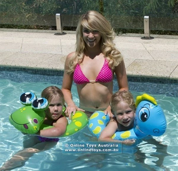 Assorted, heavy duty inflatable swim ring in dinosaur and frog designs. This split ring design (ring is not joined at the back) is suitable for children 3 years and over. Size: 61cm X 53cm.