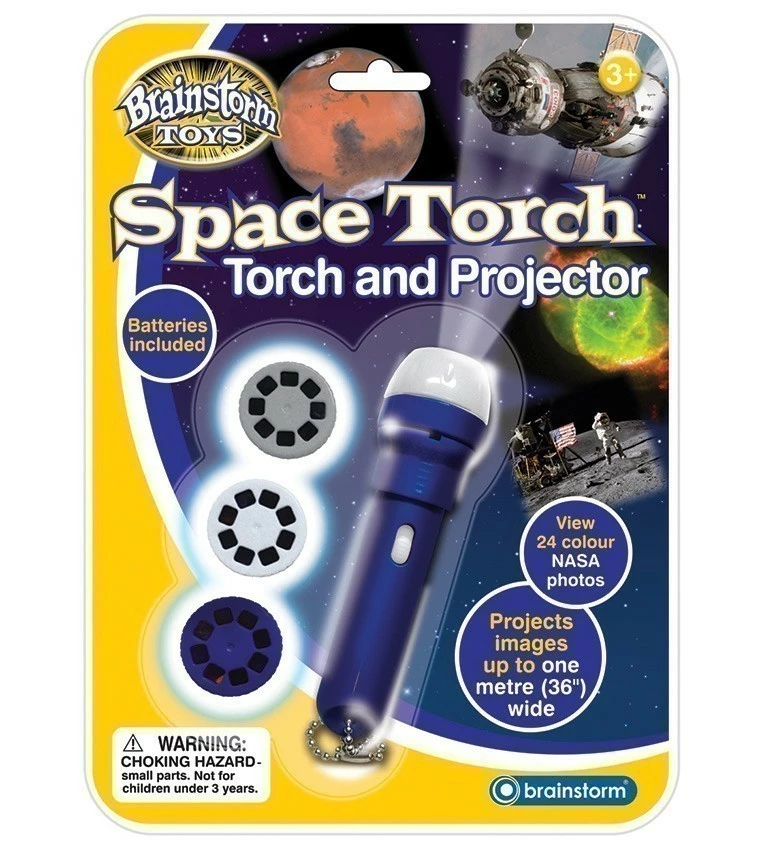 This handy torch is also a photo projector. Has 24 colour NASA and Hubble Telescope photographs, on three changeable slide disks. Projects images up to one metre wide. Turn lens head to focus.