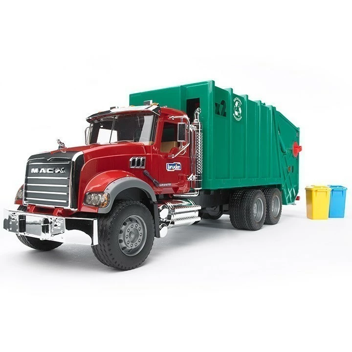 German manufacturer Bruder has got it right with this realistic rear loading garbage truck. Like real, modern rear loaders, this truck pushes the garbage into a compressing space via two carefully placed spindles. Small garbage bins and containers are included with the truck and can be emptied into it. Once the truck is full its tailgate opens to empty the collected garbage. Two garbage bins are included with this truck.