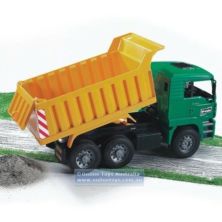 The MAN TGA Tip Up Truck features a tipping cabin that provides a view of the engine block. The mirror of the driver’s cab can be folded out. The trough can be tipped and the tailgate opened. Tread tyres complete the picture. To add to the fun of playing the MAN truck with tipping trough can be combined with the construction site trailer [art. no.: 02710] and the Light and Sound Module [art. no.: 02801] (neither included and sold separately).
