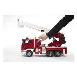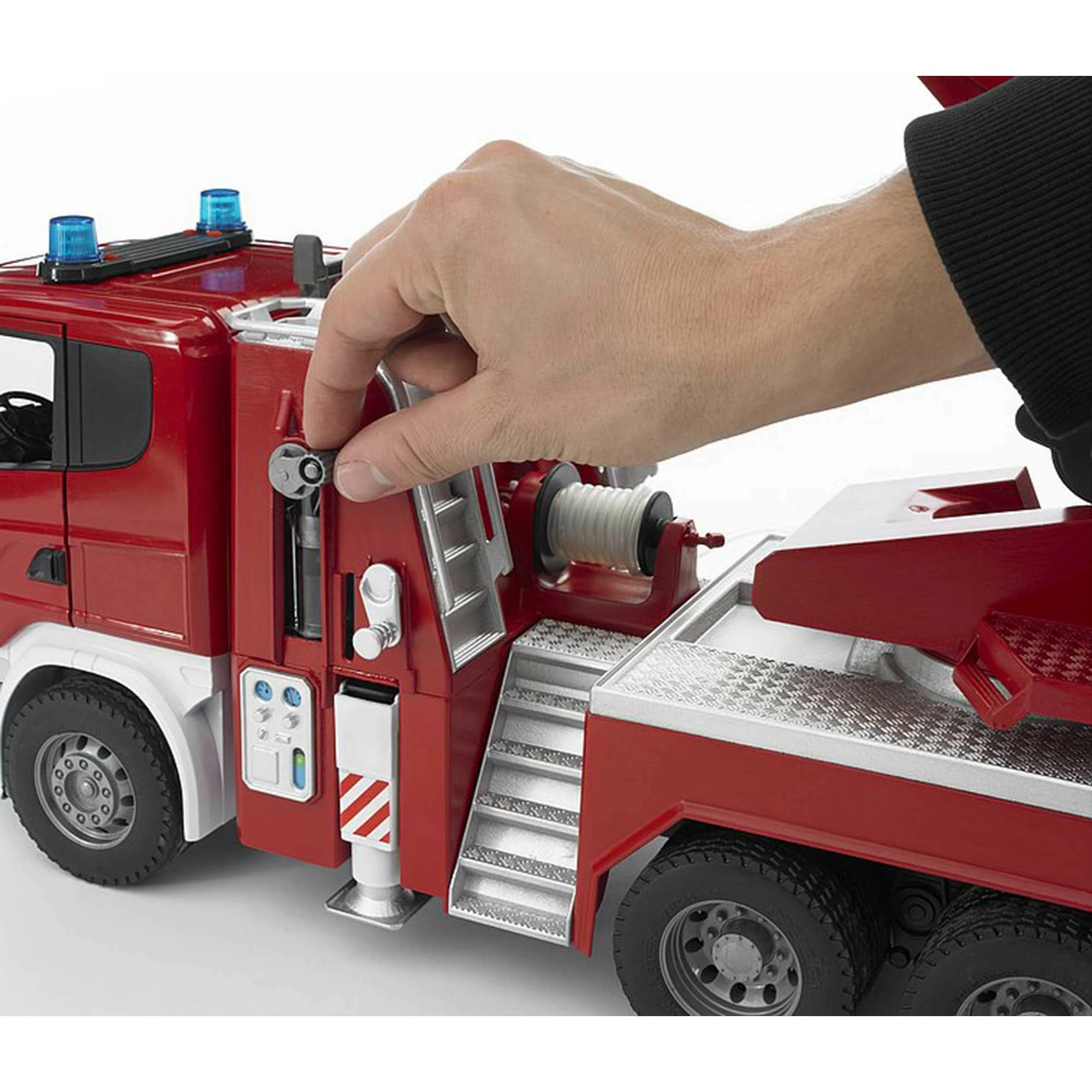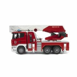 What could be more exciting than playing firemen? The new exciting feature in the BRUDER fire brigade range is the Scania R-series fire engine with ladder. As well as many small details such as opening doors and mirrors that fold back, the vehicle has an integrated water tank that can be easily filled. The water hose can be wound up, held by BRUDER figures (product # 60000 – not supplied), or secured to the basket. It also has a fully functioning nozzle. The turntable ladder with rescue basket can be moved out by a handwheel and adjusted in height. The cab has two seats and there is another seat for a BRUDER figure on the ladder. Four extendible support legs ensure vehicle stability in any situation and a large storage compartment with a door which folds up means there is extra space for storing tools. The Light and Sound Module, art. no.: 02801 with four different functions like horn, engine sound, indicator light and siren, is supplied and makes this action-packed fire brigade even more fun.
