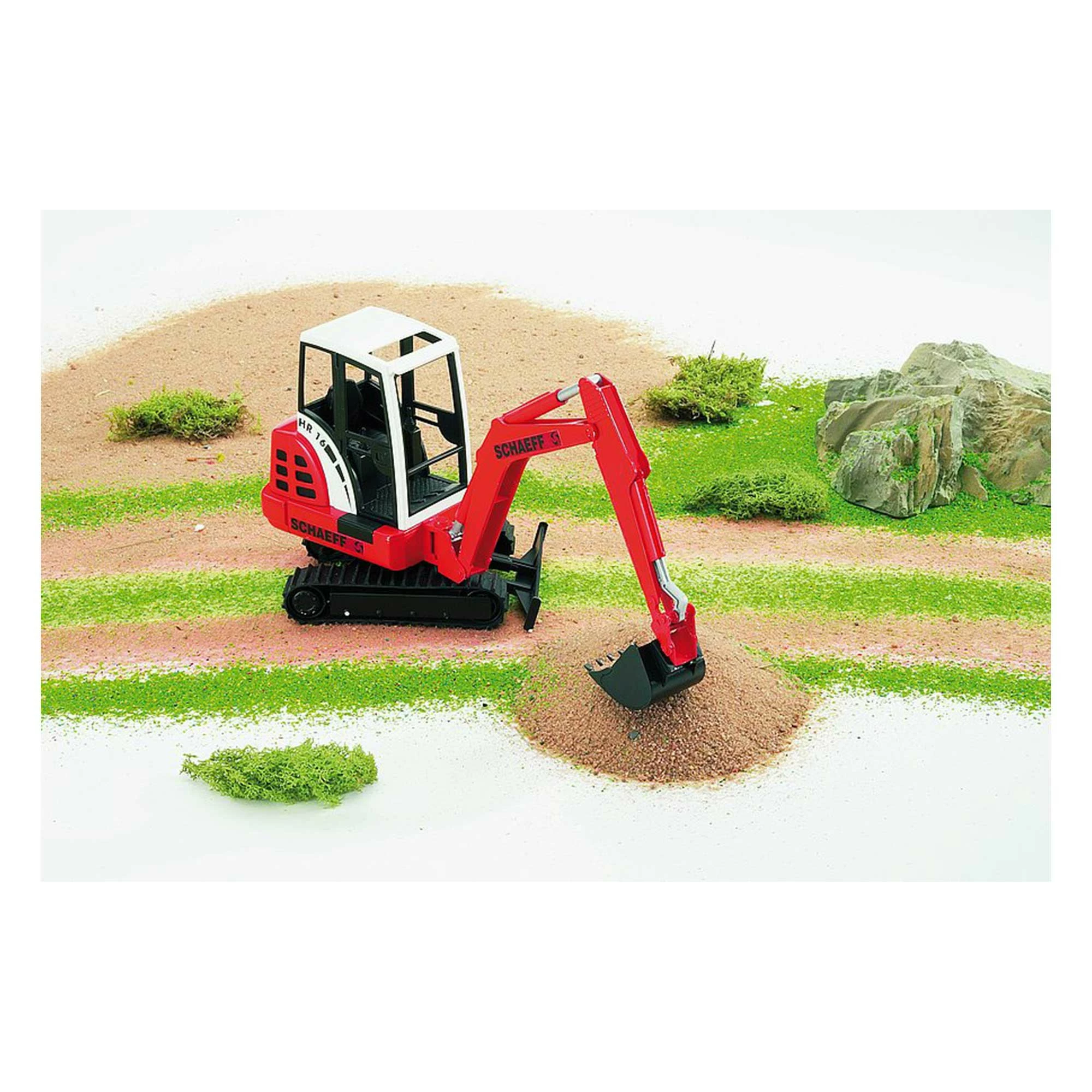 The excavator arm is fully functioning, the bucket can be detached and the plough blade is adjustable. The jib crane of the Schaeff mini excavator can be articulated laterally, making a realistic excavator function possible. Also the driver’s cab of the Schaeff mini excavator turns by 360 degrees and the rubber tracks ensure a quiet rolling motion.
