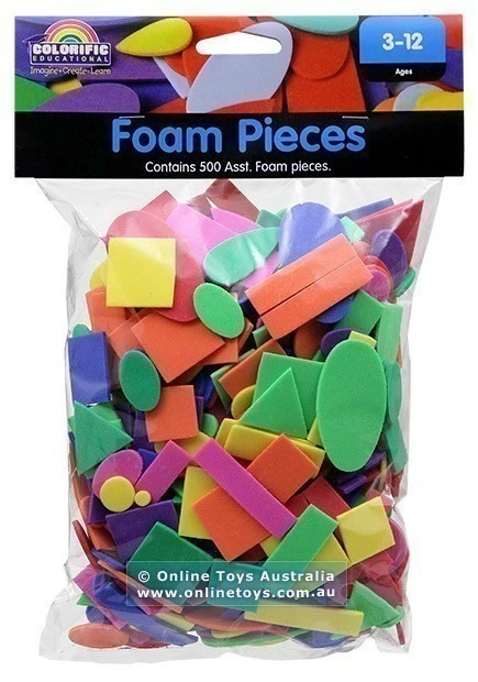 Pack of 500 random shaped pieces in brightly coloured pre-cut foam. Made from EVA foam, foam pieces are easy to work with, durable and flexible. Foam pieces can be stuck on just about anything using ordinary craft glue. Cut them, paste them, draw on them. Squares, teardrops, ovals, rectangles, circles – so many collage applications and so much fun!