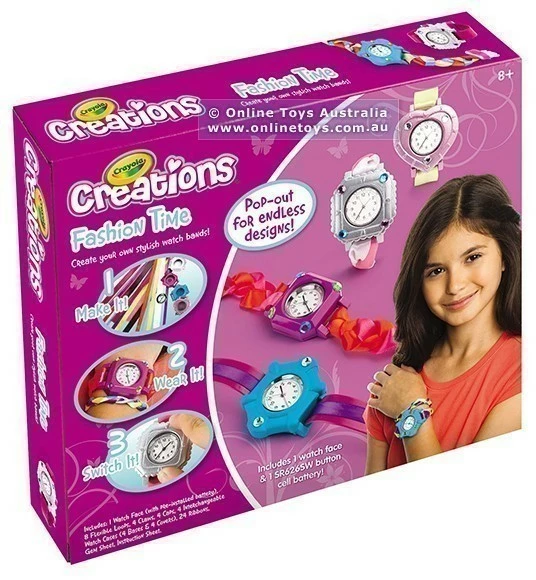 Use the included watch face and interchangeable watch cases, flexible loops, ribbons and gems to create virtually endless watch designs that you can wear on any occasion! Everything is included as well as a battery operated watch itself! For ages 8 years and over.