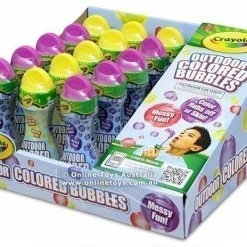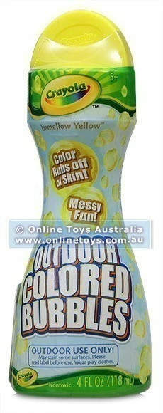 Crayola Outdoor Coloured Bubbles provide a colourful twist to bubble play! Kids will love to chase, pop and catch bubbles in their favourite colors. The brilliant colours magically rub off of skin and clean up easily from most surfaces. Outdoor Coloured Bubbles include built-in bubble wands and come in 2 bold, vibrant colours: Unmellow Yellow and Purple Pizzazz.