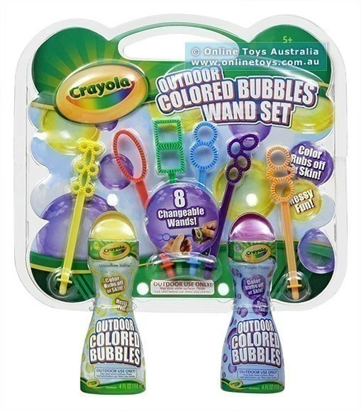 Select a wand and snap it into any Outdoor Coloured Bubbles lid to create big bubbles, baby bubbles, and everything in between! And with the Crayola Outdoor Coloured Bubbles Wand Set, colors magically rub off of skin and clean up easily from most surfaces. Includes 8 interchangeable wands and 2 bottles of Outdoor Coloured Bubbles.