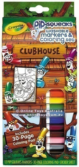 Includes: 12 Pip-Squeaks Markers, a 30-page colouring pad, 1 sticker sheet.