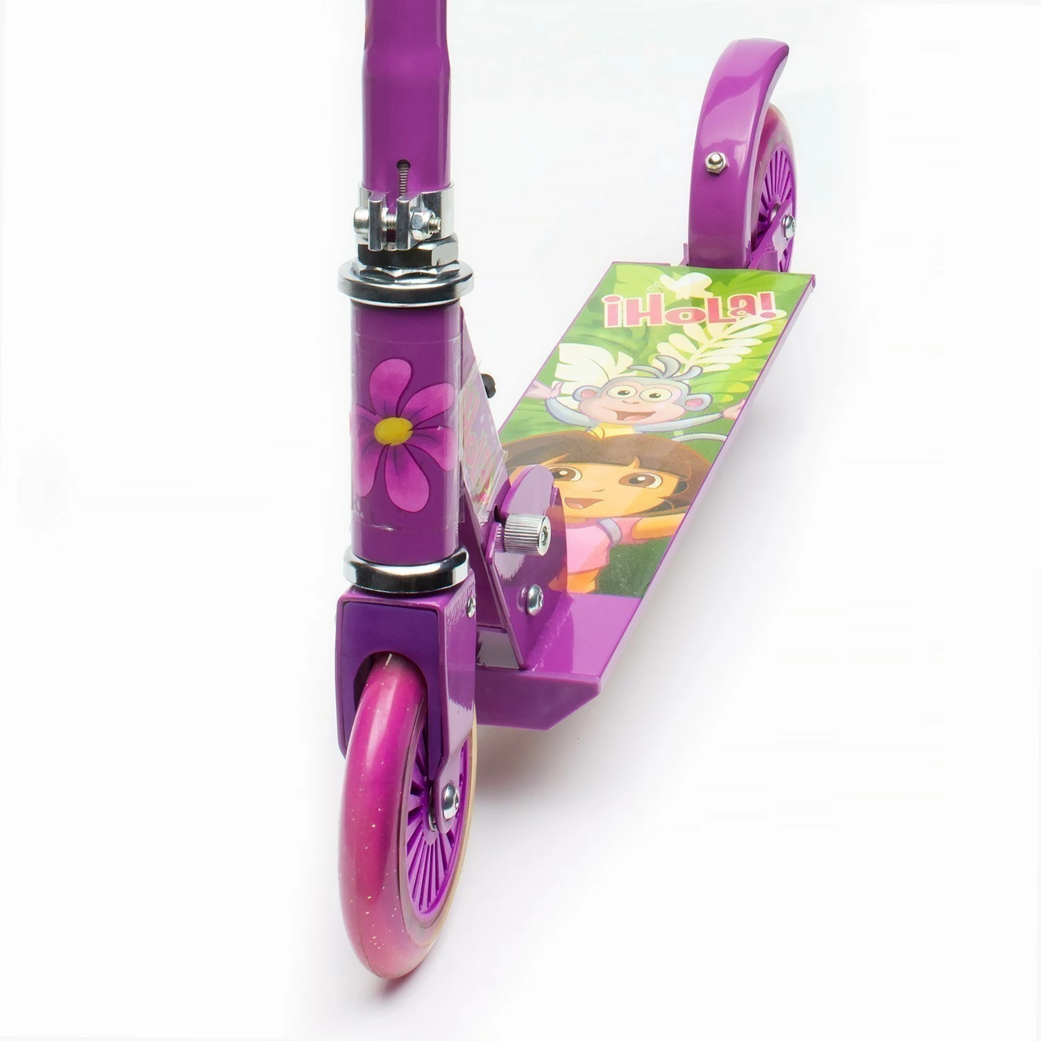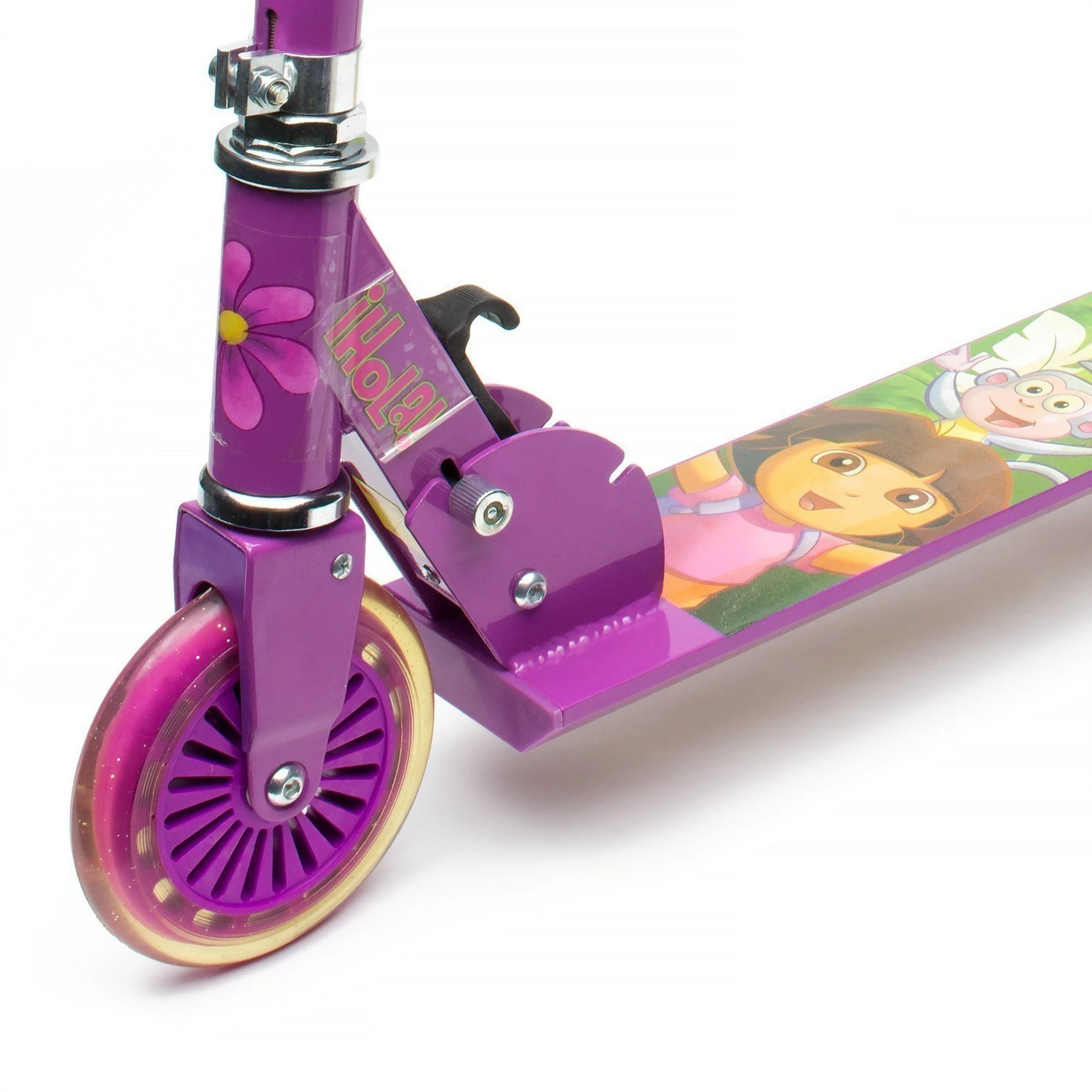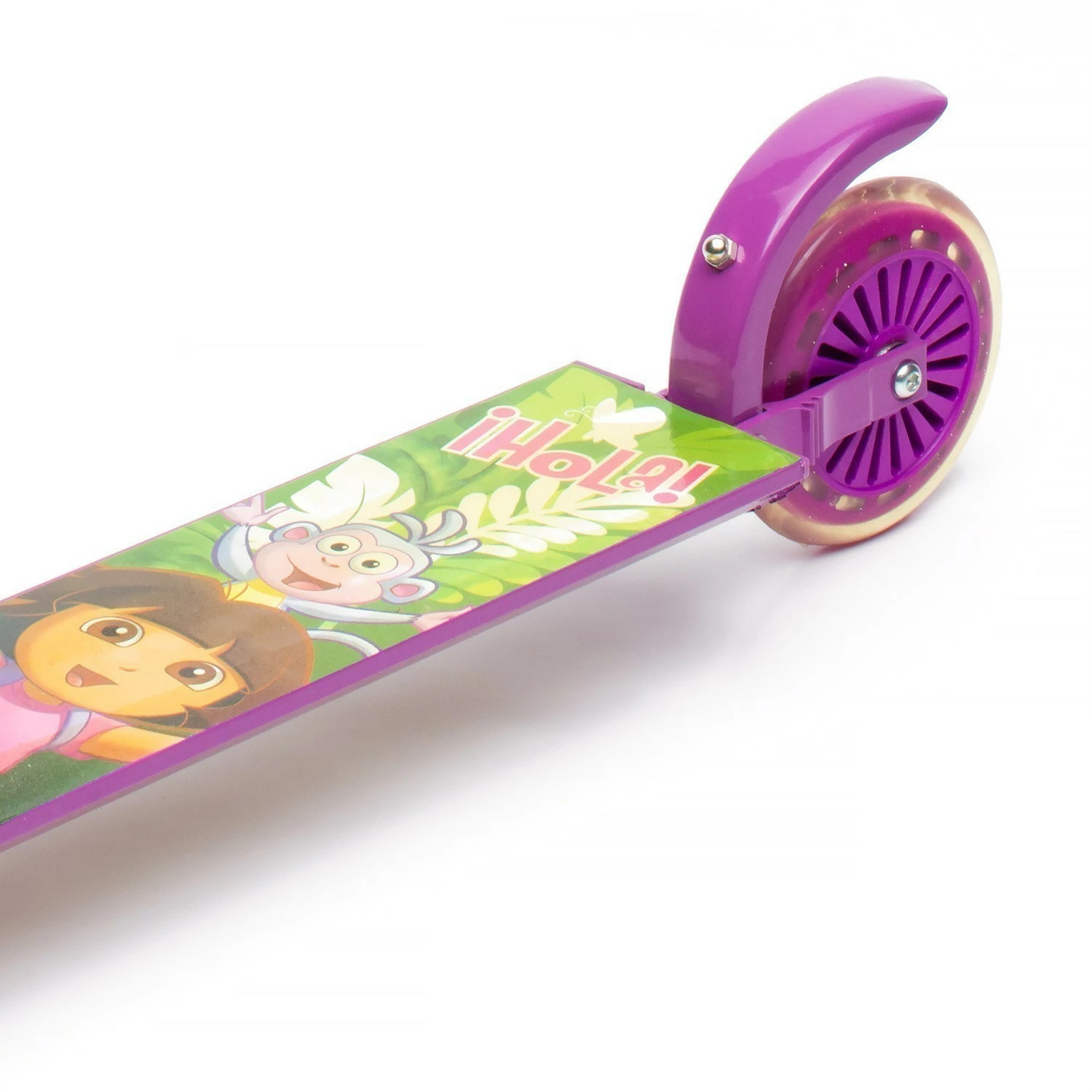 Foldable Alloy Scooter features Dora the Explorer™ decals and trademark Dora the Explorer™ colours. Strong alloy frame supports children up to 50kg in weight. Stopping is quick and easy – just remember to stomp on the rear guard to apply friction to the rear wheel! When no longer in use, just fold it away for easy storage or easy transport in the car. Scooter includes heel skates for extra fun. Size/dimensions 62 x 10 x 19cm.