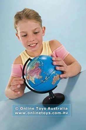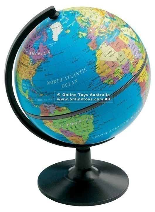 Edu-Toys 13cm Globe showing updated geographical maps and timezones. Globe shows political borders (separated with colour) and includes both country names and major cities. Globe can be manually turned and is fitted to a sturdy base. Great for the study, student desk or office.
