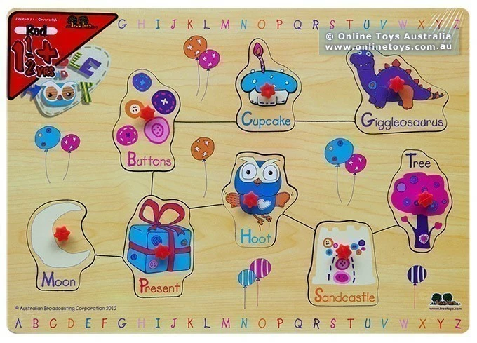Giggle and Hoot wooden puzzle consists of 8 peg pieces featuring characters from the hit ABC “Giggle and Hoot”. Can you place the correct pegs in the right holes? Puzzle size: 29.5cm X 21cm
