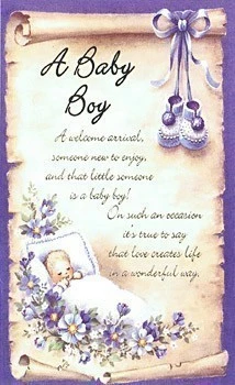 A welcome arrival, someone new to enjoy, and that little someone is a baby boy! Birthday message inside reads:” With a dear little baby boy to brighten your days Life will be happier in so many ways! Congratulations.”