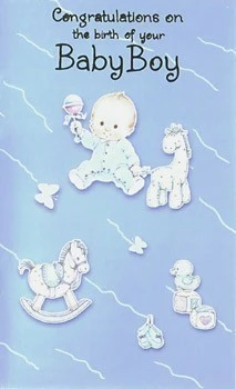 Greeting card featuring blue background, baby and toy decals on the front. Card includes the following message inside: “Welcome little man.”