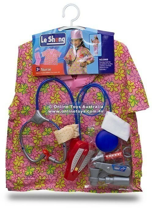 The pack features a pink & floral print costume and numerous plastic, medical tools and instruments for pretend play. Suitable for children 3-8 years of age.