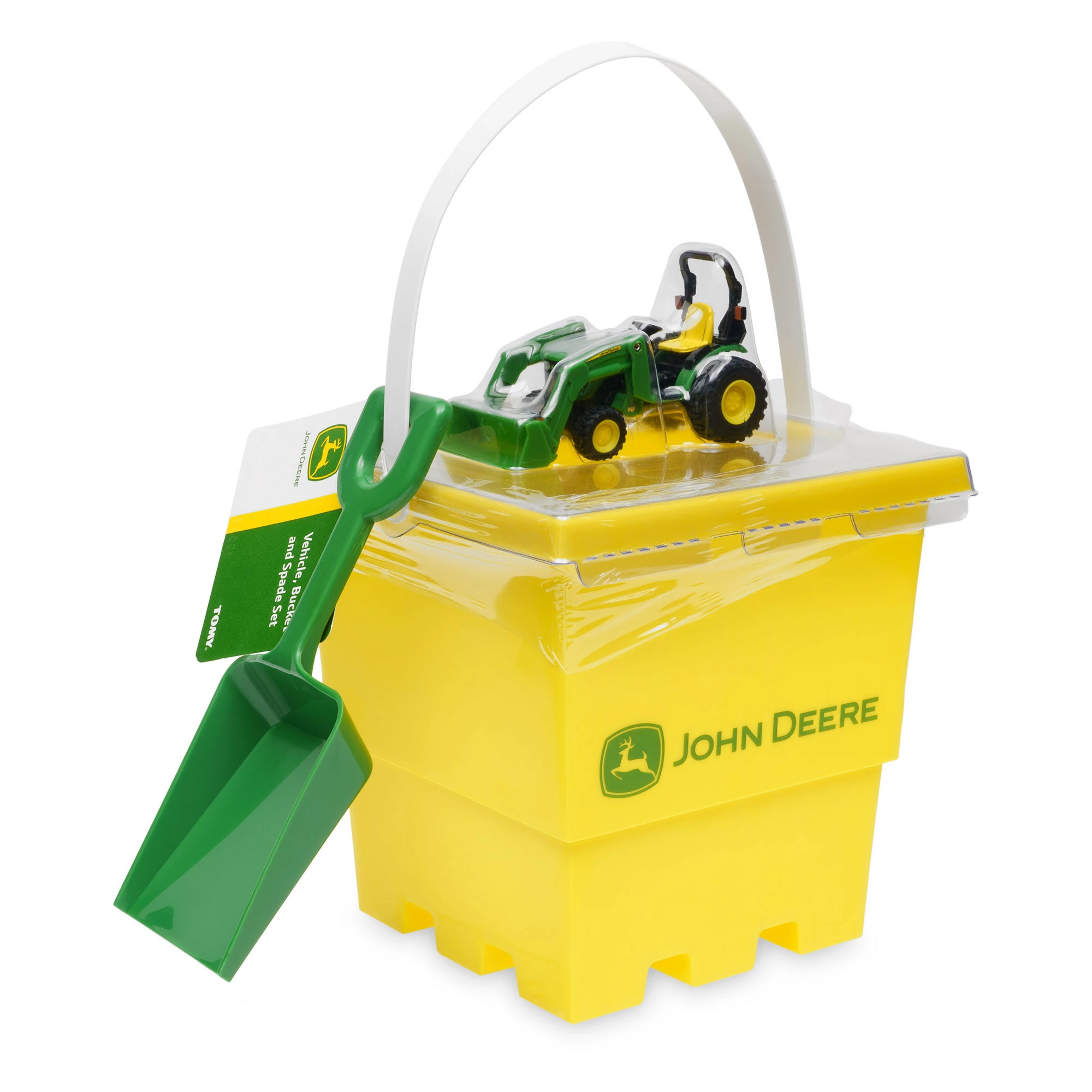 The John Deere sandbox Bucket Set features a bucket (with handle), a John Deer tractor and spade for lots of sandbox fun. Bucket is the perfect shape for building sandcastles so it’s great for the beach too!
