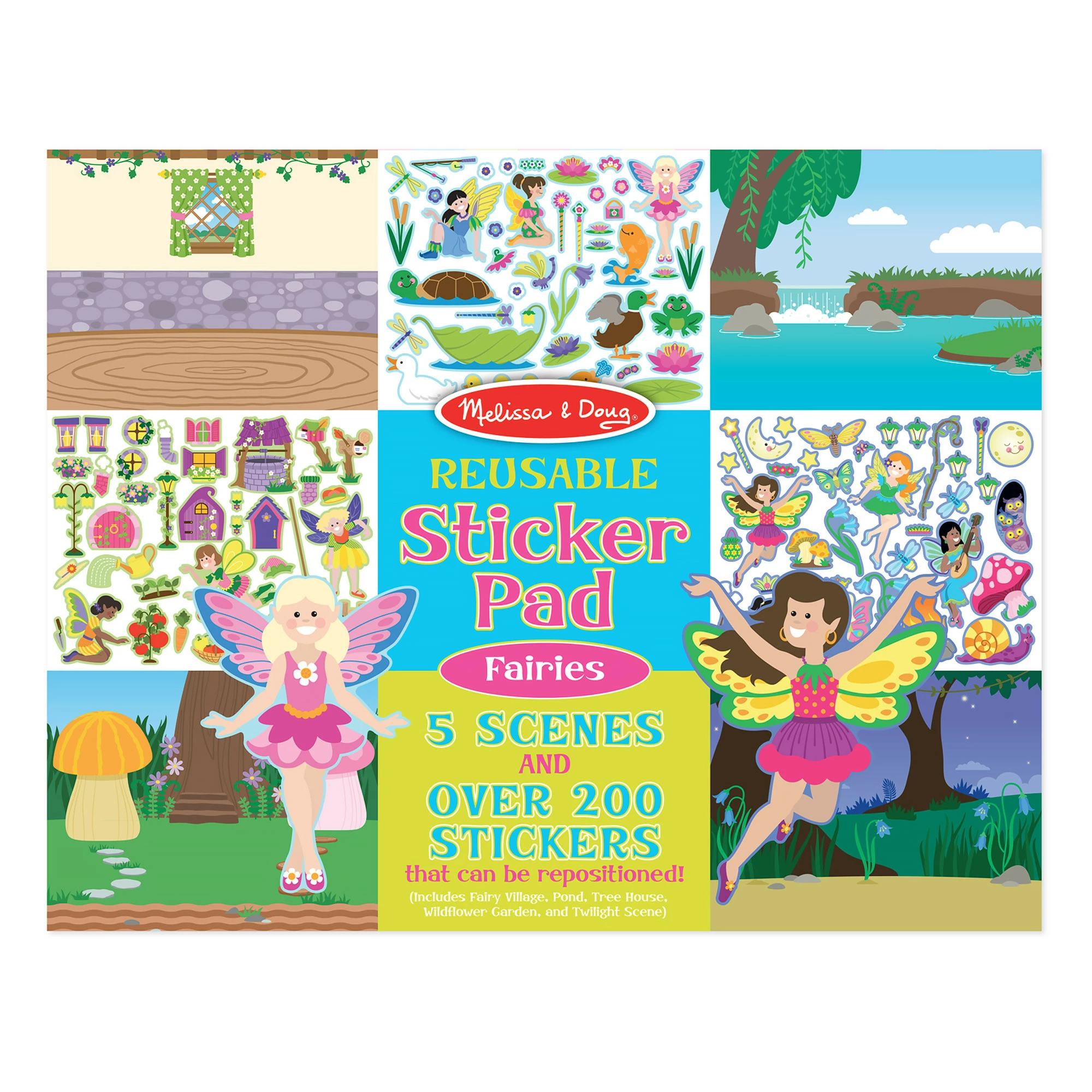 Add life to 5 over-sized fairy scenes using reusable stickers of fairies, flowers, friendly insects, animals, and many every-day household and outdoor items. Scenes include a fairy village, a pond scene, a tree house scene, a garden scene, and a twilight scene.