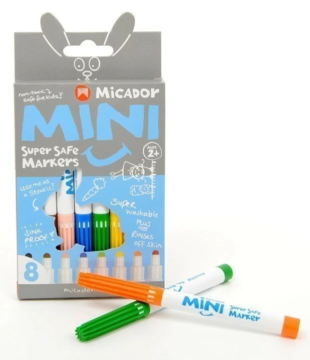 Featuring 8 child safe nibs that allows kids to draw on any angle without tip pushing into the barrel. Micador Mini Super Safe Markers are super-washable, non-toxic, and rinses off skin with just water. Accidents on clothing can be easily washed off while colours stay bright and vibrant on paper (even when ink dries). Lids are ventilated for safety which makes them ideal for children 2 years+.