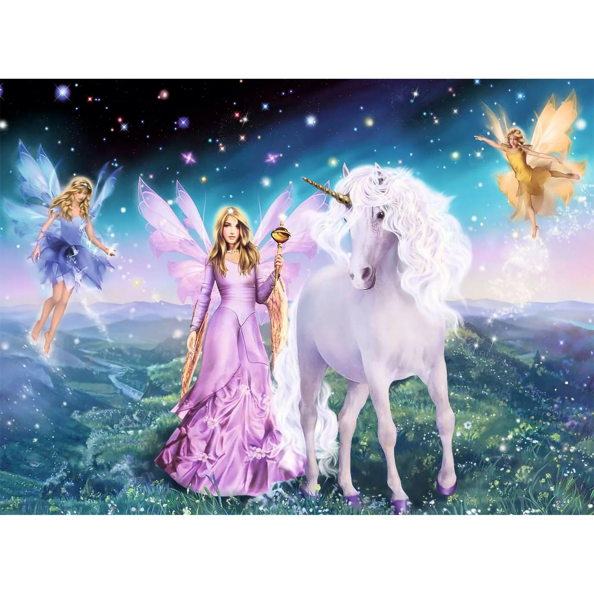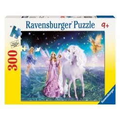 This 300 piece jigsaw puzzle features a magical scene of fairies and a white unicorn. Puzzle measures 49cm X 36cm when complete. No two pieces are the same and each piece precisely fit together for a perfect join.